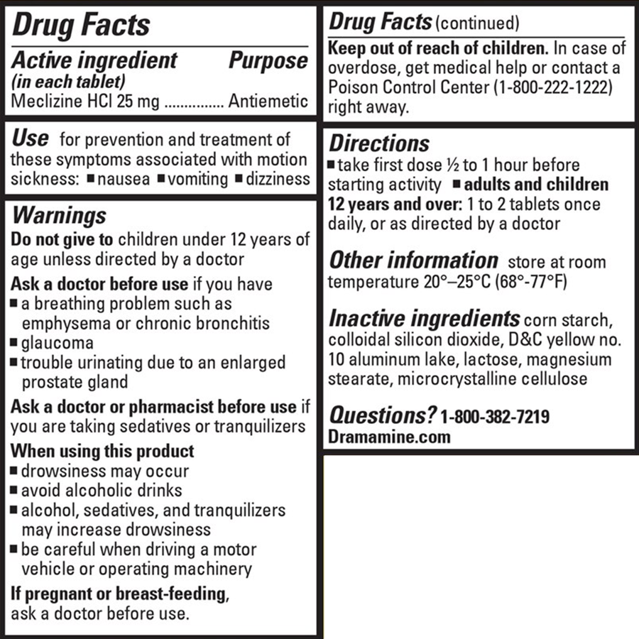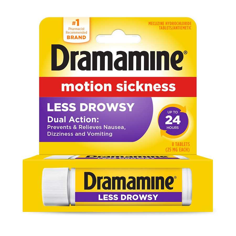 Dramamine All Day Less Drowsy Motion Sickness Relief prevents and treats motion sickness, nausea, vomiting and dizziness for up to 24 hours. The tablets come in a convenient, safety Travel Vial for anytime motion sickness symptoms strike. Get less drowsy relief from motion sickness when you need it most from the number 1 pharmacist-recommended brand!* Wherever your adventure takes you, Dramamine is a vacation essential in your travel medicine bag. Don't let motion sickness affect your plans on your next cruise, theme park, visit or road trip. Dramamine fits with your other travel size toiletries and travel must haves. If you know you are going on an adventure that is likely to cause motion sickness and nausea, take Dramamine Less Drowsy BEFORE the trek. Also, be sure to drink plenty of water and avoid alcohol, which can increase dehydration and nausea. Take Dramamine and Take Control. For adults and children 6 and older.
