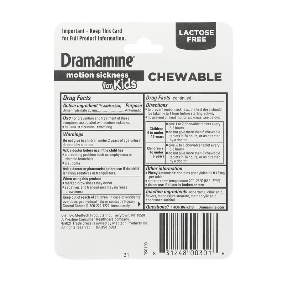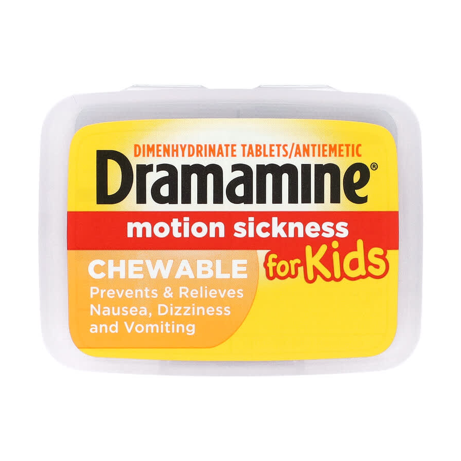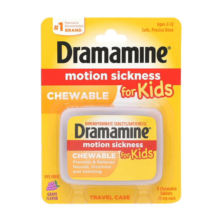 Dramamine Kids chewable grape flavored tablets are lactose and dye free; fits great with your travel essentials