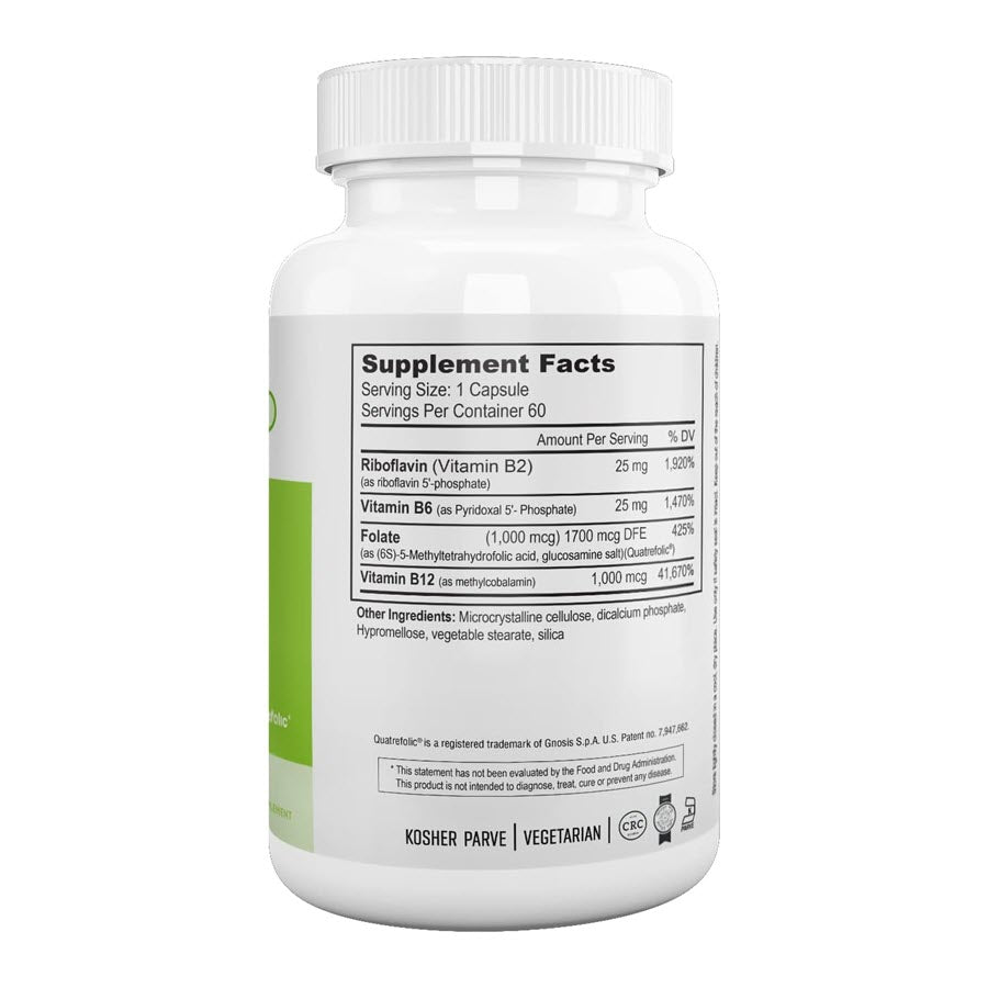 B6, B12 & Folate (5-MTHF) contains essential B vitamins that promote cardiovascular health and neurological function. This product contains Methyl Folate, the biologically active form of folic acid. Unlike folic acid, it is metabolized even in the presence of MTHFR mutation, a genetic variant that affects up to 50% of women and is known to interfere with the body’s ability to process folic acid.