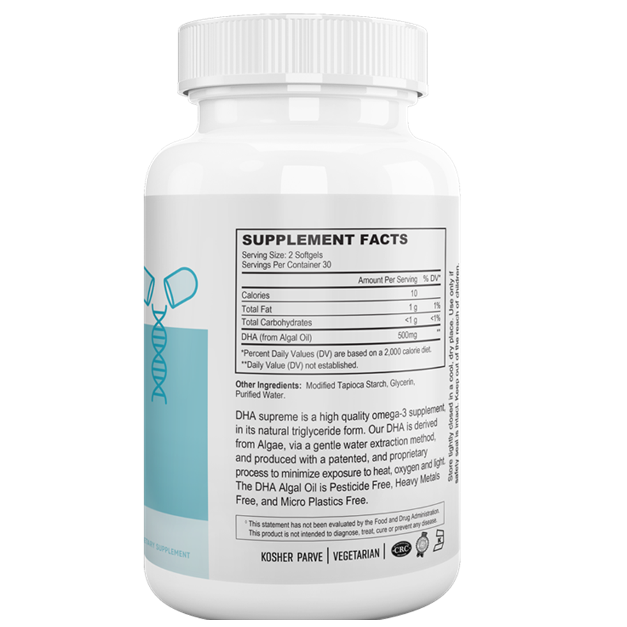 DHA high quality Omega-3 supplements in it’s natural triglyceride form. Our DHA is derived from Algae, via a gentle water extraction method and produced with patented and proprietary process to minimize exposure to heat, oxygen and light. the DHA algae oil is pesticide free, heavy metals free, and micro plastic free.