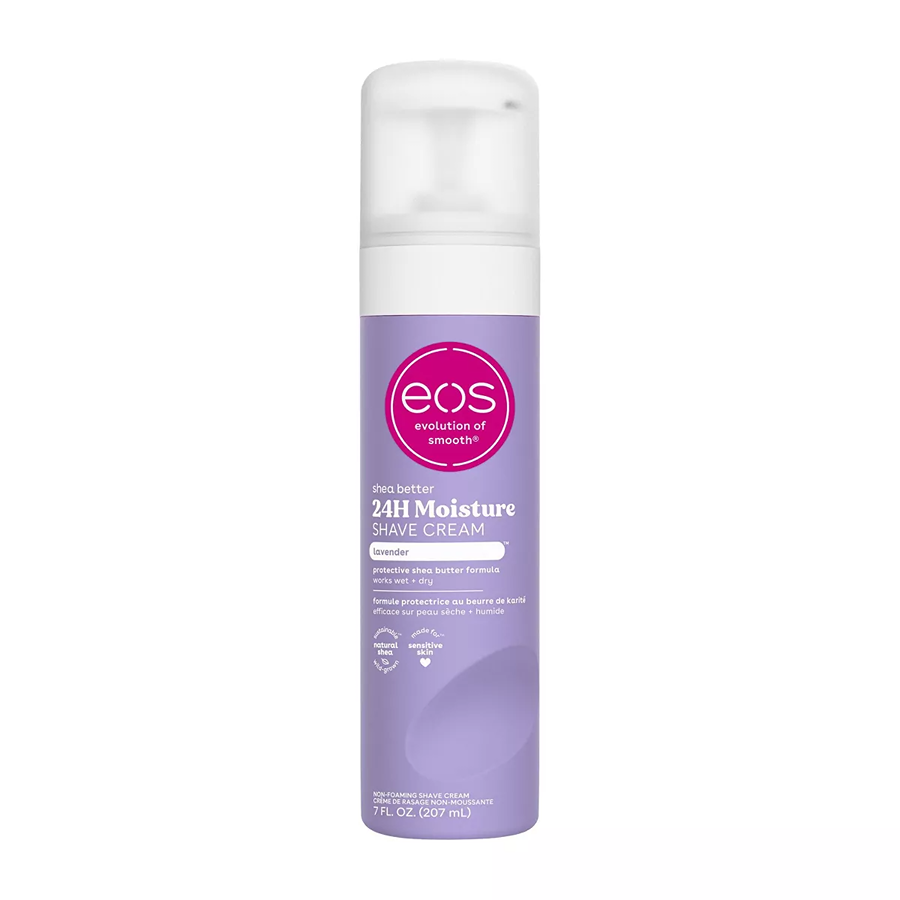 eos Lavender Shea Better womens shave cream + lotion has notes of clean lavender, warm sandalwood, and velvety amber. Get your softest, smoothest (and closest) shave ever. eos shave lotion is rich, non-foaming, and contains instantly moisturizing shea oil + lasting protection shea butter for incredible 24-hr body care hydration and lasting skin comfort, even for your bikini line. Soothing Aloe conditions + calms for the silky-smooth shave your skin deserves. eos shave cream + in-shower body lotion can be rinsed off or left on as a body moisturizer for awesomely smooth skin.